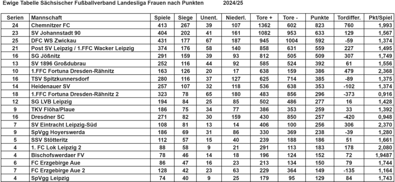 Die Geschichte des Frauenfußballs in Sachsen ist jung, seine Entwicklung aber rasant. Erst 1970 wurde der Frauenfußball von Verbandsseite offiziell erlaubt. Damals allerdings nur mit Einschränkungen: Die Spielzeit war kürzer, der Ball zudem kleiner und leichter. Mitte der 80er Jahre wurden die unterschiedlichen Regeln innerhalb der europäischen Länder von der UEFA vereinheitlicht und dem Regelwerk der Herren angepasst. Inzwischen sind ca. 6.000 Frauen und Mädchen Mitglied im Sächsischen Fußball-Verband, Tendenz steigend. Auf Landesebene gliedert sich der sächsische Spielbetrieb in die Landesliga, als höchste Spielklasse, und die Landesklasse. Diese ist seit der Saison 2014/2015 nach regionalen Gesichtspunkten in drei Staffeln unterteilt. Neben dem regulären Ligaspielbetrieb veranstaltet der SFV zudem jährlich einen Landespokal-Wettbewerb sowie eine Futsal-Landesmeisterschaft der Frauen. Außerdem finden Meisterschaften für Ü 32-Frauen statt.