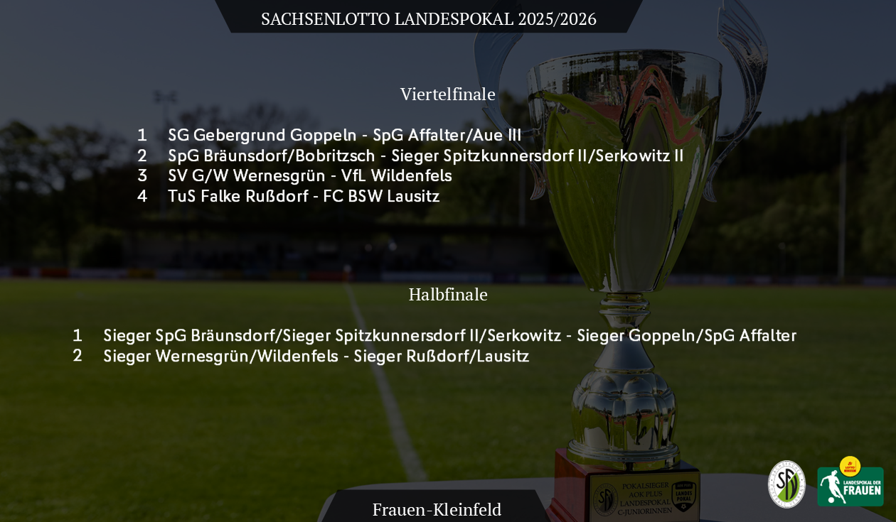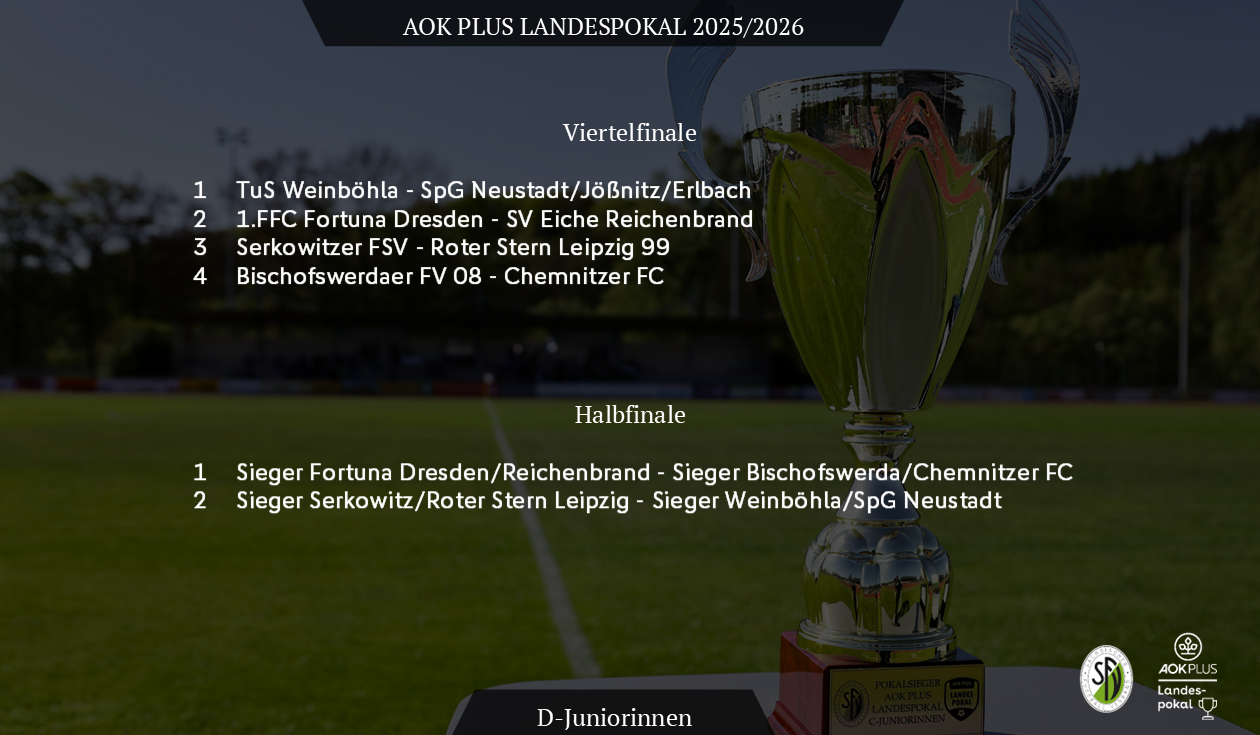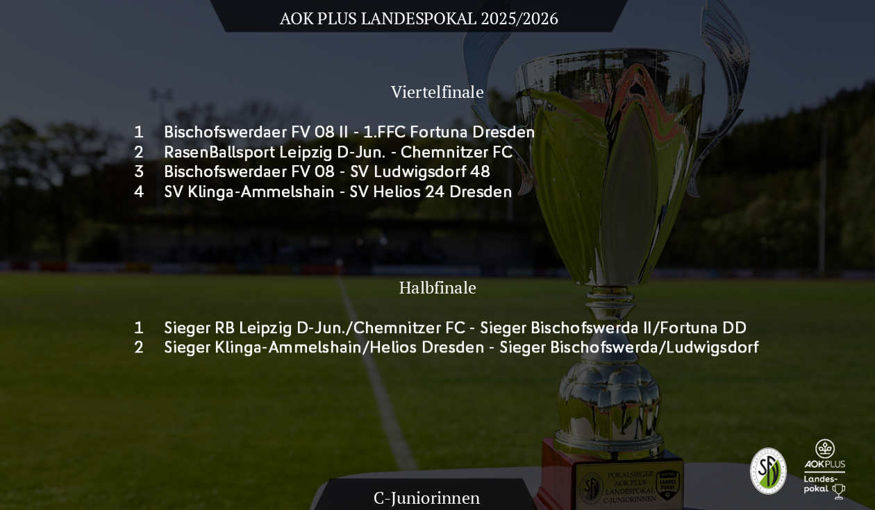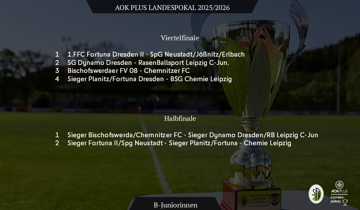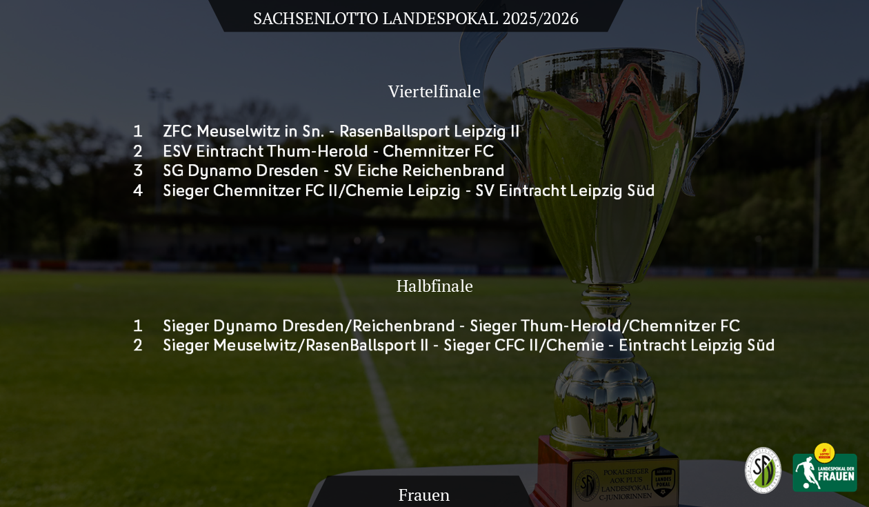 Am Mittwoch, 1. Oktober ab 14 Uhr, wurden in Abtnaundorf die Viertel- & Halbfinale der Frauen- & Mädchen Landespokale ausgelost, die laut Rahmenterminplan am 25./26. Oktober (Juniorinnen) und am 8./9. November (Frauen) gespielt werden. Unsere Losfee war Tony Staigys, Kundenbetreuer von der AOK PLUS. Die Halbfinale sind noch ohne Gewähr und ergeben sich endgültig nach den Viertelfinal-Partien. Sollten Vereine mit der 1. und 2. Mannschaft das Halbfinale erreichen, erfolgt das Spiel gegeneinander.