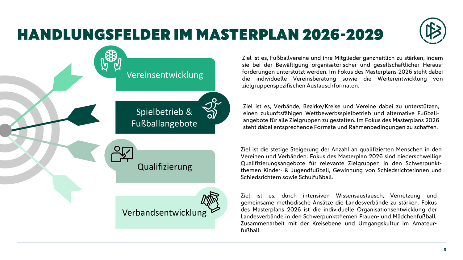 Der Masterplan bündelt Maßnahmen in vier Handlungsfeldern: Vereinsentwicklung, Spielbetrieb & Fußballangebote, Qualifizierung sowie Verbandsentwicklung.