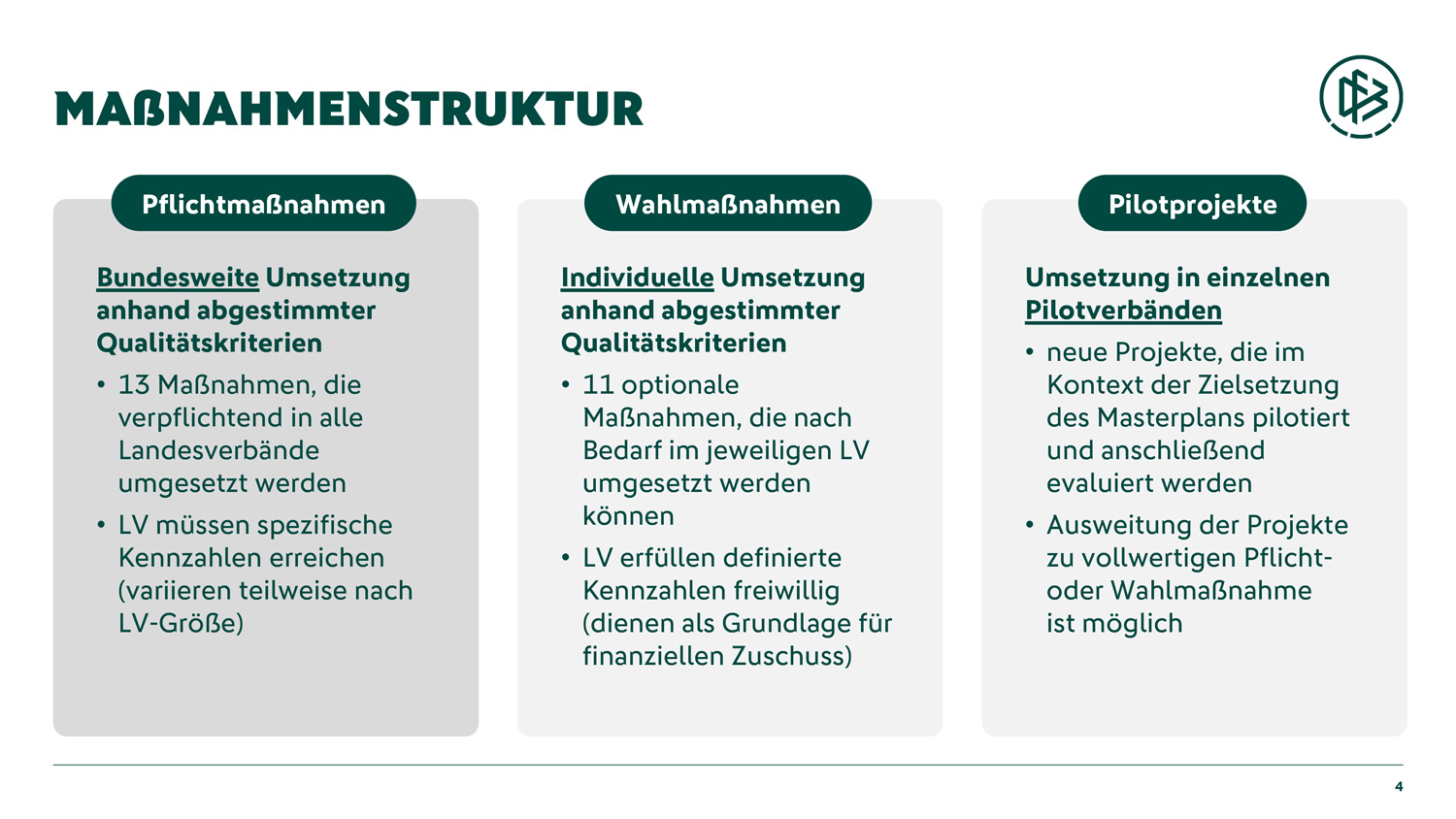 Mit einer Kombination aus Pflicht- und Wahlmaßnahmen schafft der Masterplan einerseits bundesweit einheitliche Qualitätsstandards, bietet den Landesverbänden gleichzeitig jedoch die Möglichkeit, eigene Schwerpunkte zu setzen. Neue Ideen und Ansätze können durch ergänzende Pilotprojekte auf Verbandsebene getestet und bei Erfolg ausgeweitet werden.