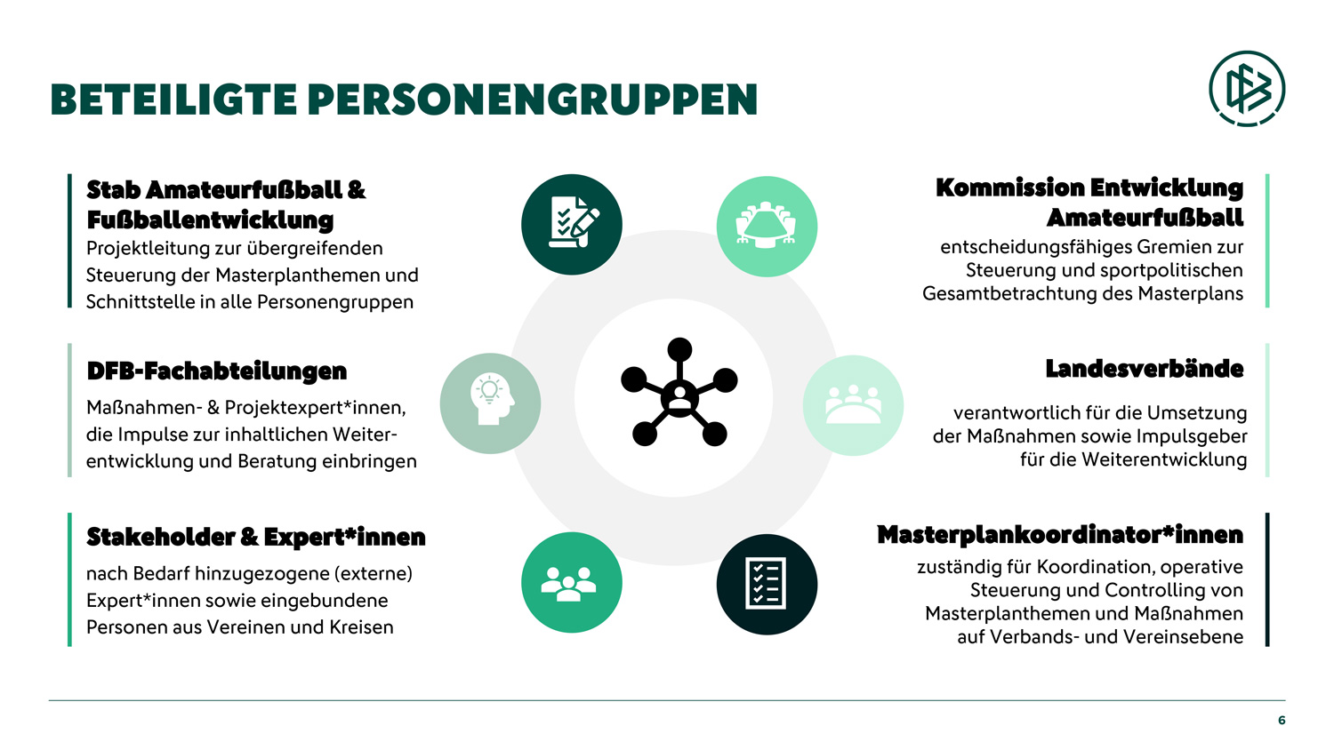 Die Erarbeitung und Ausgestaltung des Masterplans erfolgte durch die von Peter Frymuth geleitete Kommission „Entwicklung Amateurfußball“ und unter enger Einbindung von Verbandsmitarbeiter*innen sowie auf Grundlage der Ergebnisse der regelmäßig stattfindenden Amateurfußball-Kongresse und Umfrageergebnissen aus dem DFB-Amateurfußball-Barometer.