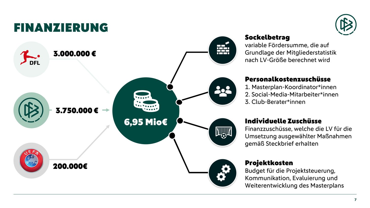 Peter Frymuth, DFB-Vizepräsident Spielbetrieb und Fußballentwicklung, sagt: „Der DFB unterstützt und fördert gemeinsam mit den Regional- und Landesverbänden den Amateurfußball. Dabei ist der Masterplan das zentrale Instrument, mit dem das übergeordnete Ziel, das weltweit einzigartige flächendeckende Netz von Fußballvereinen in Deutschland zu erhalten, unterstützt werden soll. Dass die DFL im Rahmen des Grundlagenvertrages den Masterplan unterstützt, ist ein Beleg für die Einheit des deutschen Fußballs.“