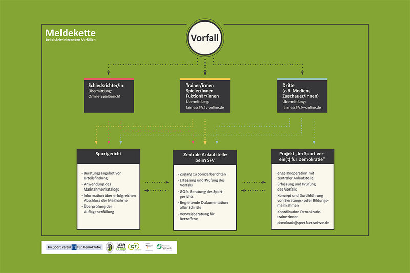 Wenn Ihr einen Vorfall wahrnehmt, meldet Euch unter fairness@sfv-online.de. Ebenso veranschaulicht die folgende Grafik, wie genau Vorfälle an die zentrale Anlaufstelle gemeldet werden können.
