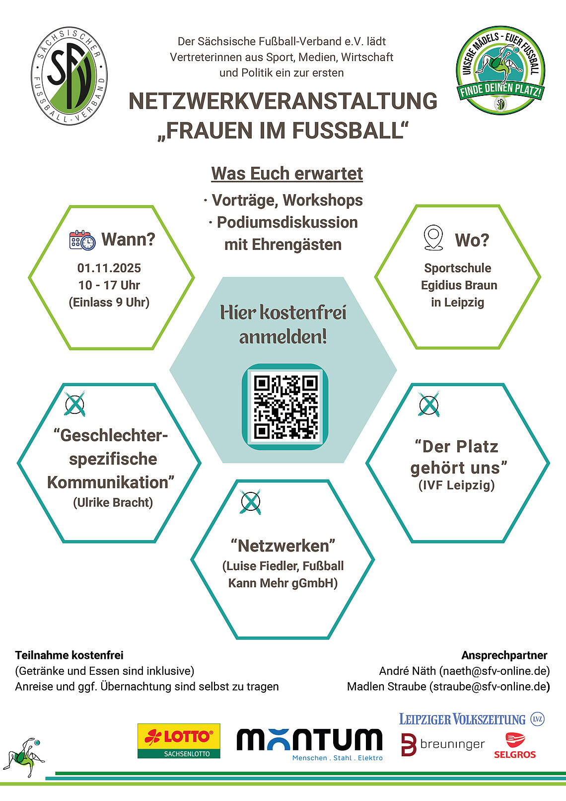 Im Rahmen unserer Strategie „Unsere Mädels – Euer Fußball“ wollen wir nicht nur die Anzahl weiblicher Akteurinnen im Fußball in Sachsen erhöhen, sondern ihnen auch den Raum für Austausch und persönlicher Weiterbildung bieten. Genau darauf dürfen sich alle Teilnehmerinen der Netzwerkveranstaltung freuen. Es wird Vorträge (u.a. Sabine Eger, adidas AG), Workshops, eine Podiumsdiskussion und natürlich genügend Zeit zum Netzwerken geben.