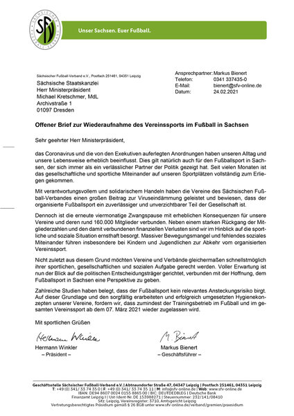 Der Amateurfußball in Sachsen befindet sich seit Monaten im Lockdown und SFV-Präsident Hermann Winkler kämpft seit Beginn der Pandemie gemeinsam an der Seite vom Landessportbund Sachsen bei politischen Entscheidungsträgern um die Interessen der sächsischen Vereine. Mit einem Brief an den Sächsischen Ministerpräsidenten Michael Kretschmer betont Winkler nun noch einmal die Bedeutung des Sports und fordert Perspektiven für den Vereinssport, vor allem für die Kinder und Jugendlichen.
