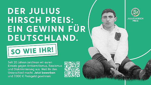 Macht euer Engagement für Vielfalt und Menschenrechte sowie gegen Diskriminierung und Antisemitismus im und um den Fußball sichtbar und bewerbt euch jetzt für den Julius Hirsch Preis des DFB.