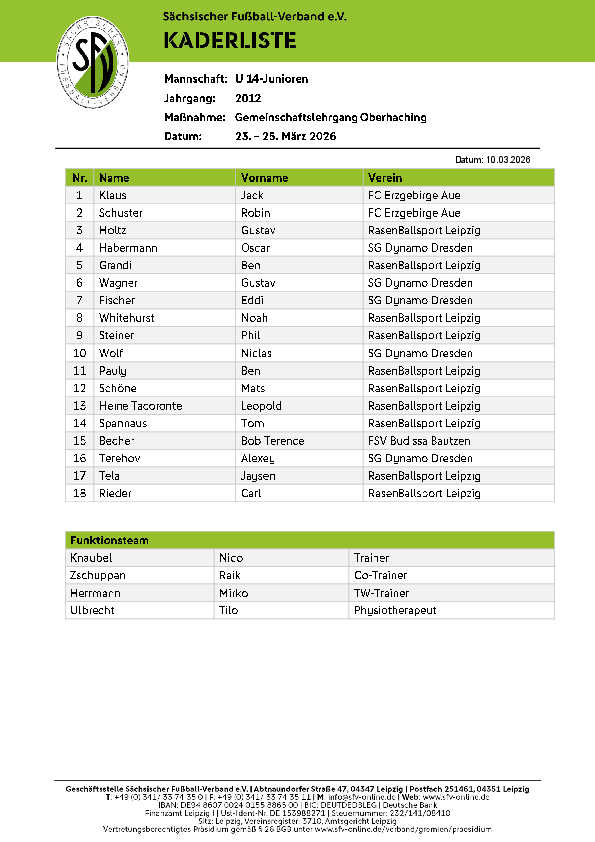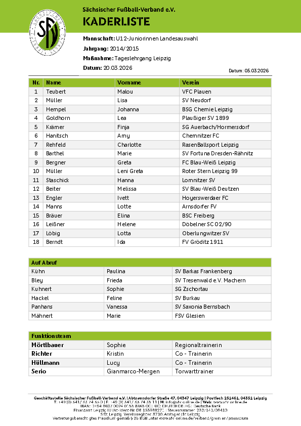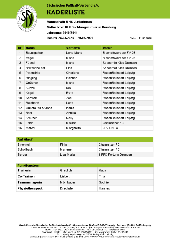 U 16-Juniorinnen Termine 2025/2026 Datum Maßnahme Ort Kader 2026 02.03.-05.03. Sondertrainingslager Leipzig Kader 25.03.-29.03. DFB-ST Duisburg Kader 25.09. - 27.09. GL…
