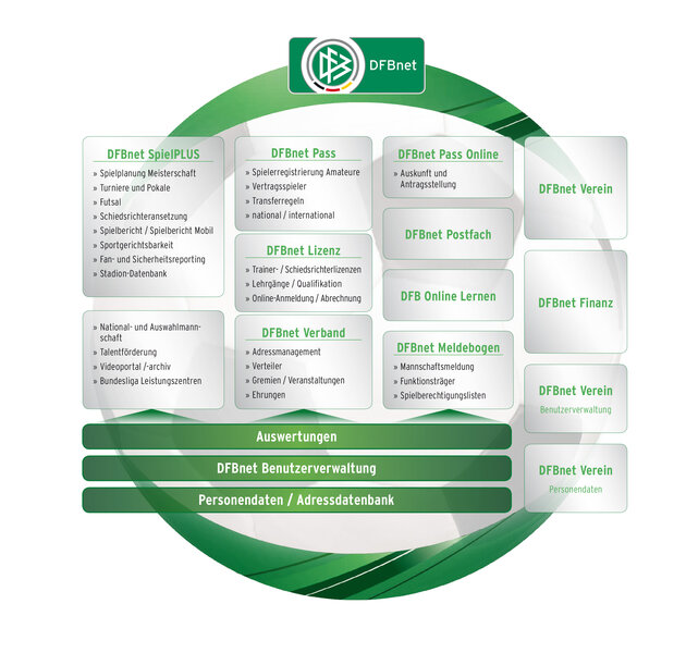 Einen Überblick über alle Module des DFBnets und ihre Funktionalitäten sind in der Broschüre "DFBnet und FUSSBALL.DE - Ein starkes Team" zu finden.